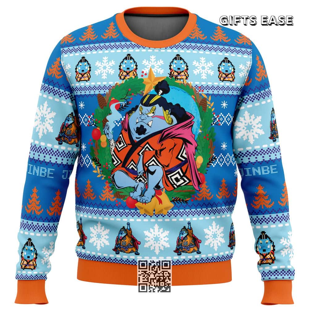 - Jinbe One Piece Ugly Christmas Sweater Snowflakes Pine Trees
